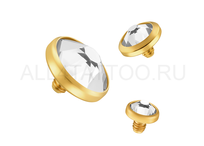 Накрутка из имплантационного титана ASTM F-136 с золотым 24х каратным PVD покрытием. Украшена кристаллом Swarovski. Резьба накруток 1,2мм подходят к микродермалам и украшениям толщиной 1,6мм с внутренней резьбой. Диаметр накруток: 3, 4, 5 и 7мм.
