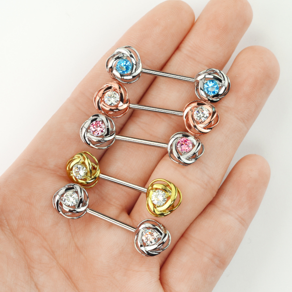 Украшение для груди со штангой из хирургической стали 316L с розами из родированной латуни, украшенными стразом по центру.