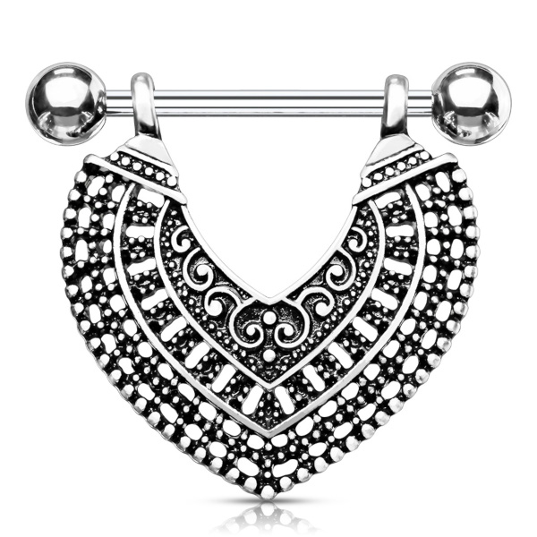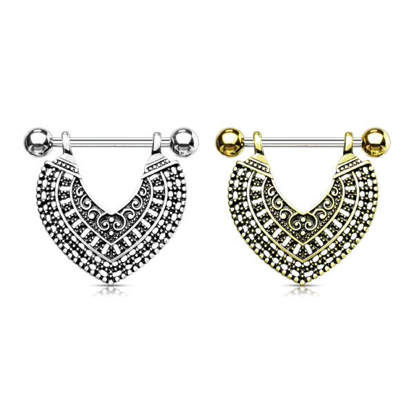 Украшение для груди со штангой из хирургической стали 316L и декоративной частью из родированной латуни. Представлена вариация с золотым покрытием.