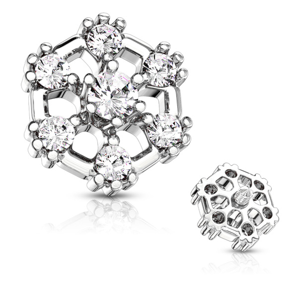 Накрутка из хирургической стали 316L с латунным цветком диаметром 6 мм, украшенным кристаллами. Подходит для украшений толщиной 1,6мм с внутренней резьбой и микродермалов.