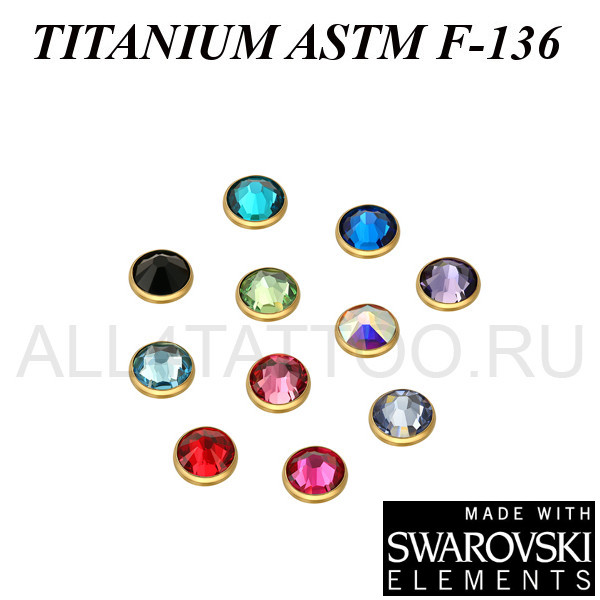 Накрутка из имплантационного титана ASTM F-136 с 24х каратным золотым PVD покрытием. Украшена кристаллом Swarovski. Резьба накруток 1,2мм подходят к микродермалам и украшениям толщиной 1,6мм с внутренней резьбой.
