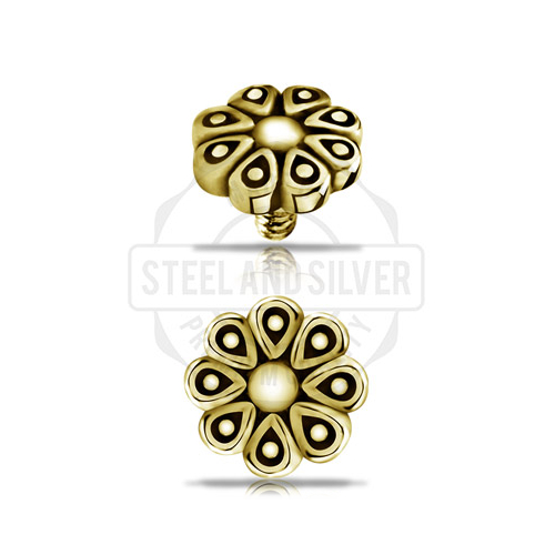 Накрутка из хирургической стали 316L с PVD покрытием жёлтого золота. Диаметр декоративной части - 6мм. Резьба накруток 1,2мм подходят к микродермалам и украшениям толщиной 1,6мм с внутренней резьбой.