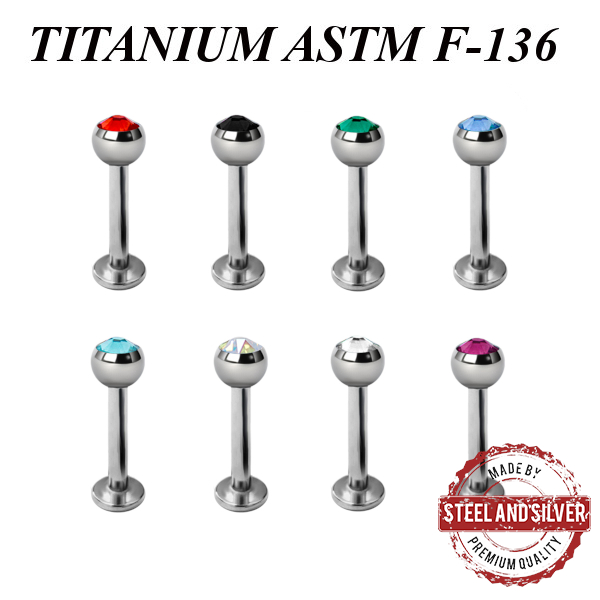 Лабрет из имплантационного титана 6Al-4V-Eli ASTM: F-136, украшен премиальным кристаллом. Внешняя резьба.