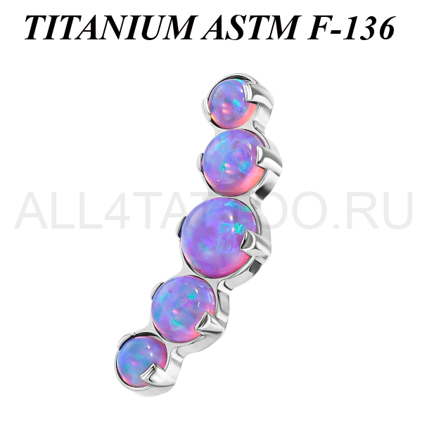 Миниатюрный кластер из имплантационного титана 6Al-4V-Eli ASTM: F-136 украшен лабораторными опалами 3, 2.5, 2мм. Длина кластера 12,6мм. Резьба 0,9мм подходит для украшений толщиной 1 и 1,2мм с внутренней резьбой, резьба 1,2мм подходит для украшений толщиной 1,6мм с внутренней резьбой.