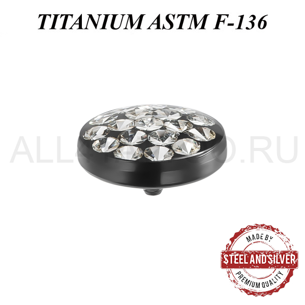 Накрутки из имплантационного титана ASTM F-136 с чёрным  PVD покрытием, украшенные прозрачными кристаллами Swarovski. Резьба накруток 1,2мм подходят к микродермалам и украшениям толщиной 1,6мм с внутренней резьбой.