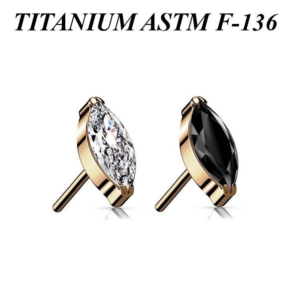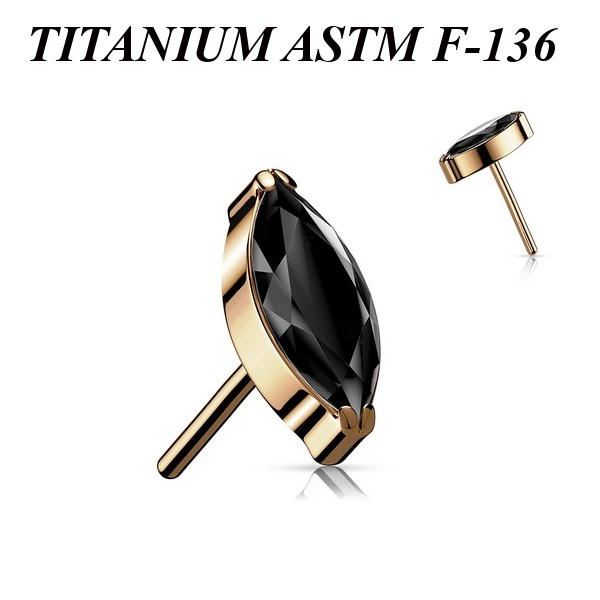 Вставка для безрезьбовых украшений из имплантационного титана 6Al-4V-Eli ASTM: F-136 с PVD покрытием розового золота. Украшена фианитом огранки "маркиз".