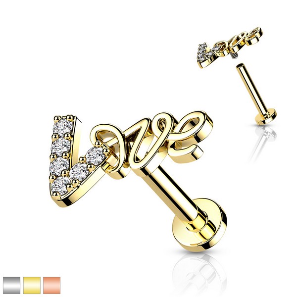 Лабрет из хирургической стали 316L с внутренней резьбой. Представлен в трёх вариантах: классический стальной и с PVD покрытием жёлтого и розового золота. Накрутка из родированной латуни, украшена фианитами. Размер накрутки: 9x5мм.