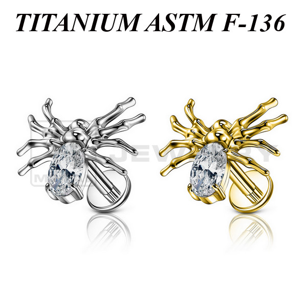 Лабрет с внутренней резьбой из имплантационного титана 6Al-4V-Eli ASTM: F-136 с фигурной накруткой в форме паука, украшенной прозрачным фианитом. Представлен в двух вариантах: классический титановый и с золотым PVD покрытием. Размер накрутки: 10х10,7мм.