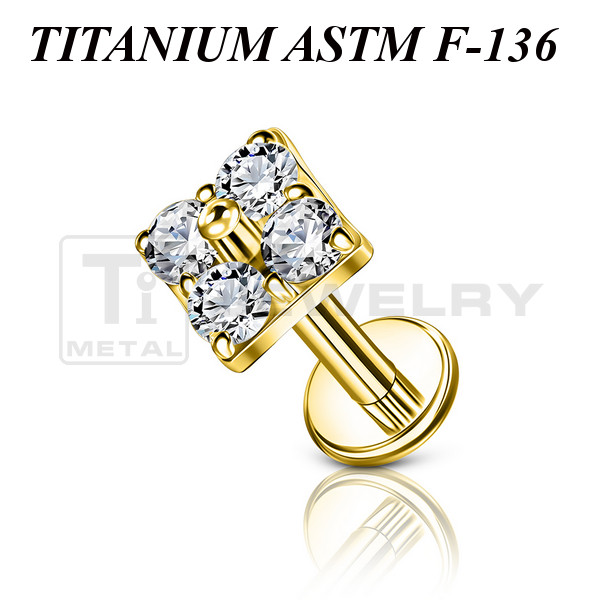 Лабрет с внутренней резьбой из имплантационного титана 6Al-4V-Eli ASTM: F-136 с накруткой украшенной прозрачными фианитами. Представлен в двух вариантах: классический титановый и с золотым PVD покрытием. Размер накрутки: 4,3х4,3мм.