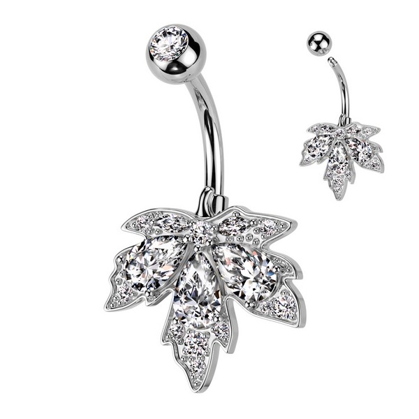 Банан из хирургической стали 316L с декоративной частью из родированной латуни, украшенной прозрачными фианитами. Представлен в двух вариантах: классический стальной и с золотым PVD покрытием.