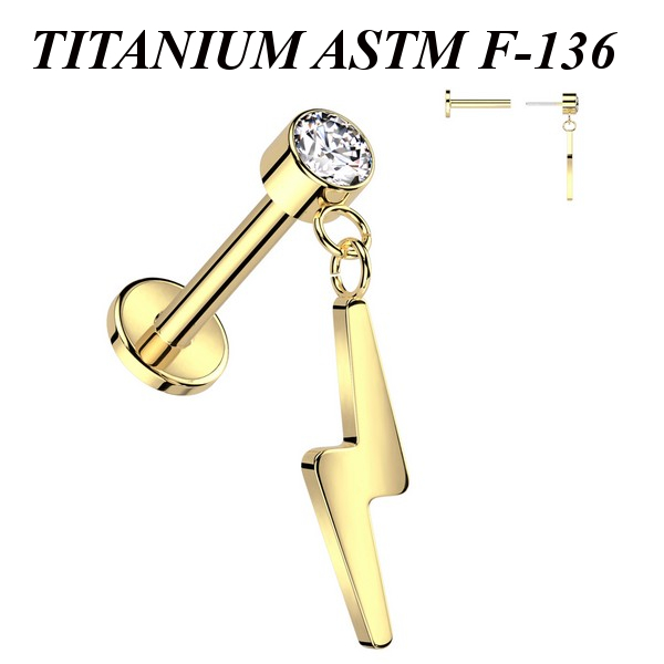 Безрезьбовой лабрет из имплантационного титана 6Al-4V-Eli ASTM: F-136. Представлен в двух вариантах: классический титановый и с золотым PVD покрытием. Украшен вставкой с прозрачным фианитом и фигурной подвеской в форме молнии.