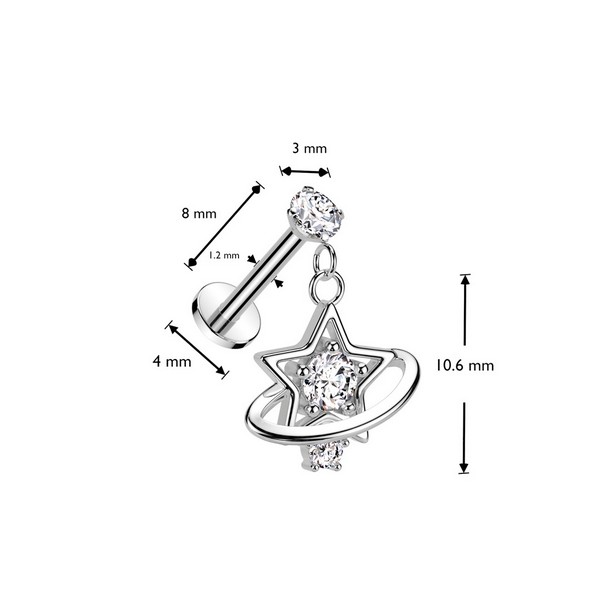 Лабрет с внутренней резьбой из хирургической стали 316L с декоративной частью из родированной латуни. Украшен фианитами. Представлен в двух вариантах: классический стальной и с золотым PVD покрытием.