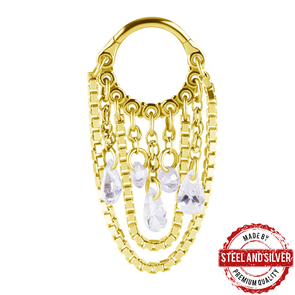 Кликер из хирургической стали 316L с золотым 24х каратным PVD покрытием. Украшен кристаллами Cubic Zirconia.