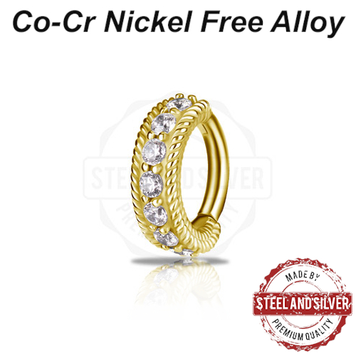 Овальный кликер из сплава кобальт-хрома, без содержания никеля. Украшен прозрачными кристаллами Premium Cubic Zirconia. Представлен так же вариант с 18-ти каратным PVD покрытием.